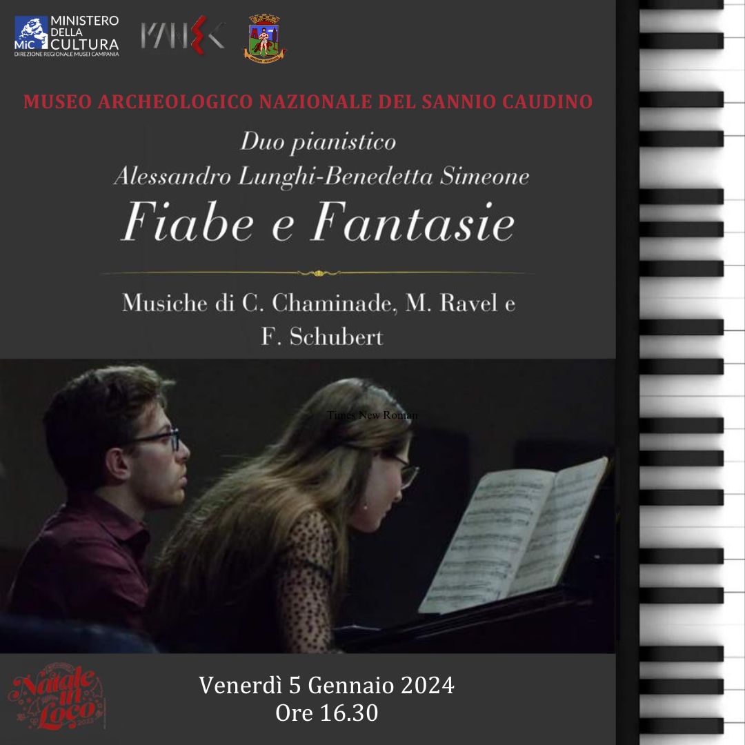 Il primo appuntamento è per venerdì 5 gennaio alle ore 16.30: il duo pianistico Alessandro Lunghi – Benedetta Simeone propone “Fiabe e Fantasie”, con musiche di C. Chaminade, Ravel e Schubert.