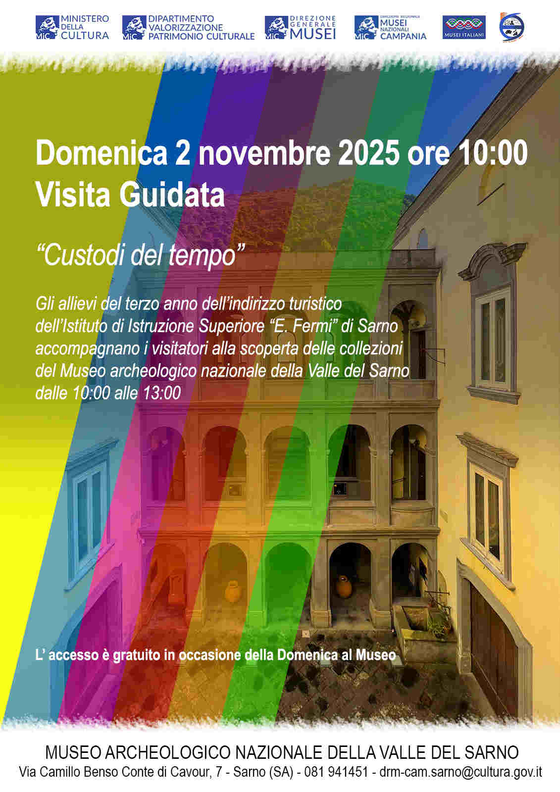 L’iniziativa si inserisce nell’ambito dell’accordo per i Percorsi per le Competenze Trasversali e l’Orientamento sottoscritto fra la Direzione regionale Musei Campania e l’Istituto di Istruzione Superiore “E. Fermi” di Sarno, che prevede lo svolgimento delle attività ogni prima domenica del mese fino a maggio 2026.