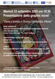 Dopo i saluti istituzionali di Giacomo Franzese, Direttore del museo, e Emma Tortora Dirigente Scolastico del liceo “T.L. Caro” di Sarno, avrà luogo la presentazione della graphic novel “Dante il bombo e l’Ironica Commedia, Inferno” di Jessica Dardano, selezionato alla XXXVII edizione del Salone internazionale del Libro di Torino.