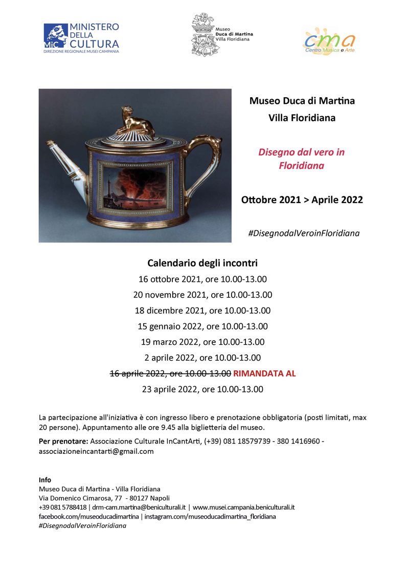 Sabato 23 aprile 2022 alle 10.00 al Museo Duca di Martina nella Villa Floridiana, ultimo incontro di Disegno dal Vero in Floridiana, organizzato dalla Direzione regionale Musei Campania in collaborazione con l’Associazione culturale InCantArti – Centro Musica e Arte di Napoli.