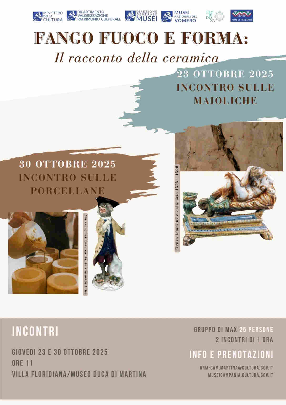 L’incontro del 30 ottobre 2025 sarà dedicato alle porcellane europee: tra Meissen, Capodimonte, Sèvres e la Manifattura ferdinandea, l’attenzione sarà rivolta alle ricche collezioni di porcellane italiane ed europee conservate al primo piano del Museo. Alla fine del percorso, nel vestibolo, avrà luogo la dimostrazione del processo creativo di un manufatto in porcellana, mostrando al pubblico i passaggi dalla porcellana cruda al prodotto finito, attraverso la tecnica di colaggio, la modellazione manuale, l’essiccazione, la cottura, l’invetriatura e la decorazione.