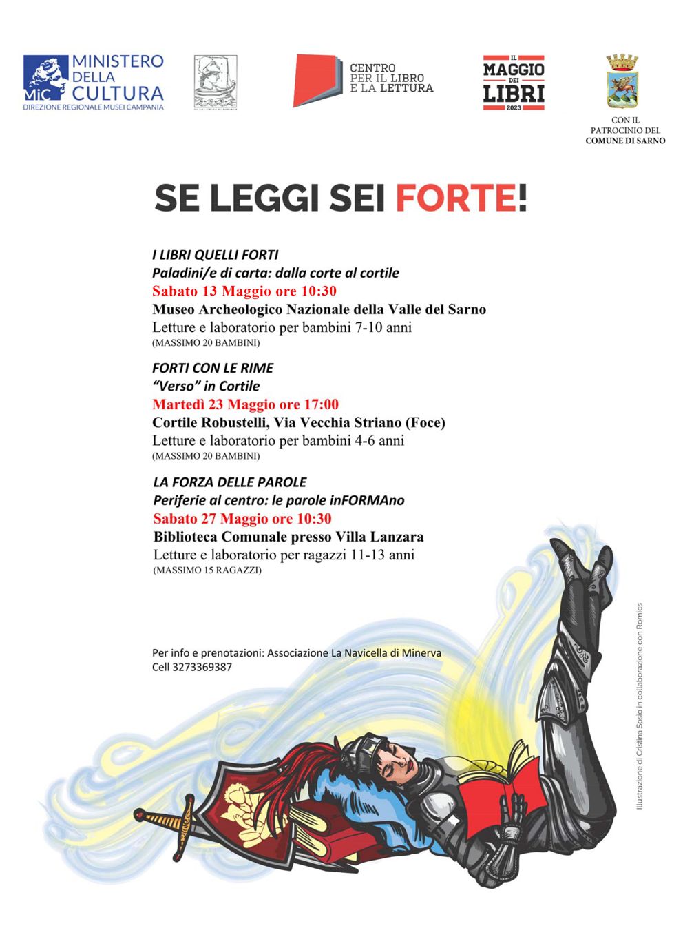 Sabato 13 maggio 2023, dalle 10.30 alle 12.30, nell’ambito dell’appuntamento annuale “Il maggio dei Libri”, promosso dal Centro per il Libro e la Lettura, che questo anno ha come tema “Se leggi sei forte!”, il Museo della Valle del Sarno in collaborazione con l’Associazione Culturale “La Navicella di Minerva”, accoglierà in cortile i bambini e le bambine tra i 7 e i 10 anni con letture appassionate e attività laboratoriali dedicate al tema.