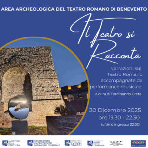 In occasione delle festività natalizie, sabato 20 dicembre 2025 il Teatro Romano di Benevento sarà aperto in via straordinaria dalle 19.30 alle 22.30 (ultimo ingresso alle ore 22.00), nell’ambito del Piano di valorizzazione del Ministero della Cultura.