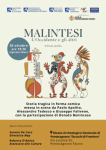 Giovedì 30 ottobre 2025 alle ore 19.30 il Museo Archeologico Nazionale di Pontecagnano ‘Gli Etruschi di frontiera’, in collaborazione con il Comune di Pontecagnano Faiano, ospiterà la rappresentazione teatrale “Malintesi. L’Occidente e gli altri” messa in scena dall’antropologo Paolo Apolito, da Alessandro Tedesco e Giuseppe Falivene, con la partecipazione di Alessandro Tedesco.