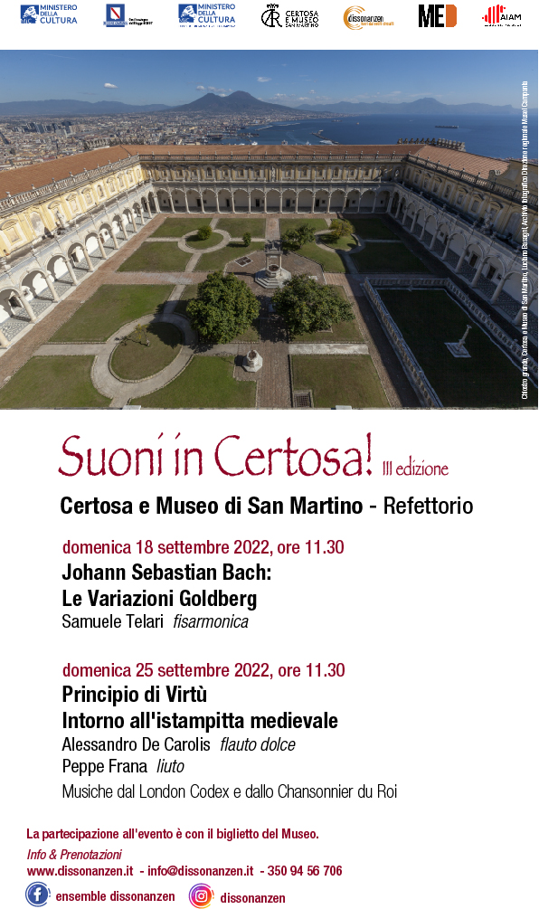 «Siamo molto felici di collaborare per il terzo anno consecutivo con la Certosa e Museo di San Martino» – dichiara Tommaso Rossi, curatore della rassegna – «Per la terza edizione, Suoni in Certosa! propone un programma che ha come protagonisti strumenti di raro ascolto nelle stagioni concertistiche: la fisarmonica da un lato e il flauto dolce e il liuto dall’altro. Una inedita versione per fisarmonica delle Variazioni Goldberg di Bach realizzata da Samuele Telari e il virtuosismo delle Istampitte medioevali eseguite da Alessandro De Carolis e Peppe Frana sono due modi di concepire, a distanza di secoli, l’arte della variazione».