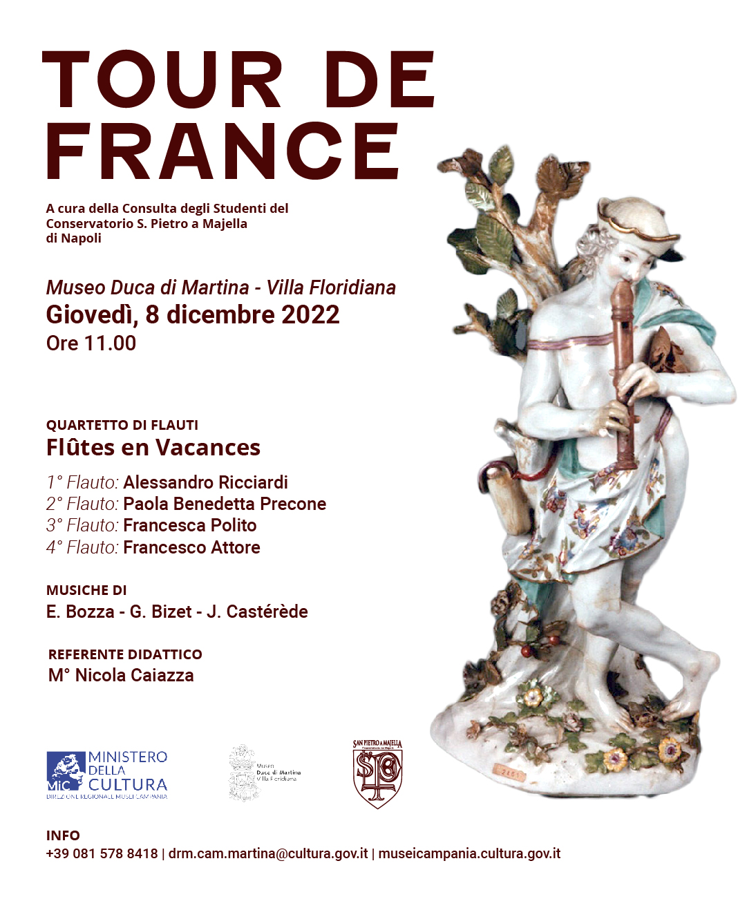 Il quartetto Flûtes en Vacances, composto da Alessandro Ricciardi, Paola Benedetta Precone, Francesca Polito e Francesco Attore, si esibirà in “Tour de France”, con l’esecuzione di una scelta di brani di famosi compositori francesi che spaziano tra ‘800 e ‘900.